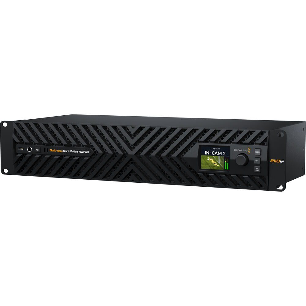 The Blackmagic StudioBridge 10G PWR is designed to bridge low-cost single link 10G Ethernet SMPTE-2110 connections into high-end redundant 100G Ethernet based systems. It converts and combines 8 channels of 10G Ethernet into a redundant pair of 100G Ethernet connections. That means you can plug in 8 separate 10G Ethernet Ultra HD devices. Each 10G Ethernet port has a massive 90W of PoE++ power, so you can power equipment such as converters and cameras directly from their Ethernet connections!