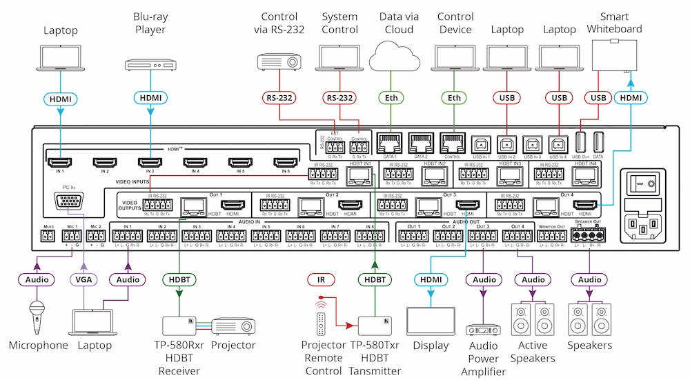 - Resolutions — Up to 4K60 4:4:4 on the HDMI ports; up to 4K60 4:2:0 on the HDBaseT ports; and up to 1080p60 on the VGA input.