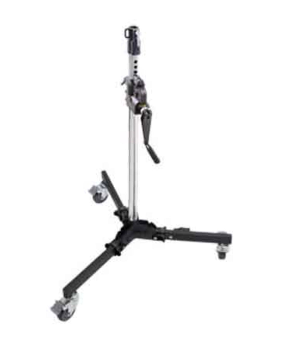The Kupo 2-Section Low Base Wind-Up Stand with Auto Self-Lock is Constructed by chrome plated steel with gear column which is an ideal combination of strength and safety. The crank handle raises a maximum load of 35kg (77 lbs) to a height of 190cm (74.8”) in 2.2cm (0.87") increments per single clockwise revolution, self-locking for safety. The black anodized steel base that features a low base for extra stability, braking wheels, one riser. Standard female 28mm (1-1/8”) junior receivers stand on top. The legs fold up for transport and storage.