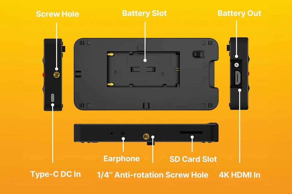 This monitor only weighs 175g without battery and has a size similar with your phone. With a plastic ABS polycarbonate shell and a built-in aluminum sheet, it is not only light but also quite sturdy as well. It also has two metal 1/4'' metal screw holes with anti-rotation pin holes, you can attach it on your camera, gimbal, cage... You can fit it into all kinds of setups without loose.
